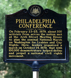 The Philadelphia Conference was to the LGBT civil rights movement what the Seneca Falls Convention was to the women’s rights movement. In February 1979, in response to the assassination of San Francisco Supervisor Harvey Milk, 300 activists from around the nation met at Philadelphia’s Arch Street Meetinghouse to fulfill Milk's dream of a march on the National Mall. Eight months later, on October 14, about 100,000 protesters participated in the National March on Washington for Lesbian and Gay Rights. The march established gay and lesbian rights as a national civil rights movement.